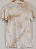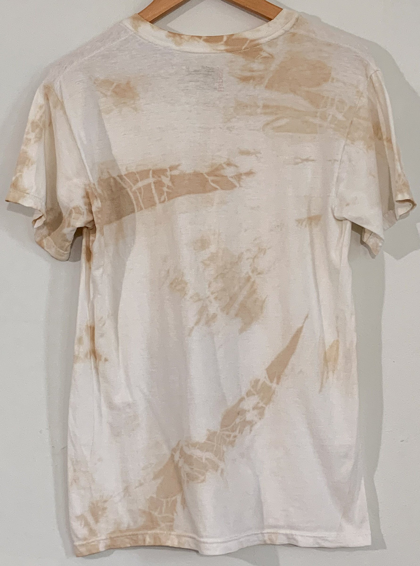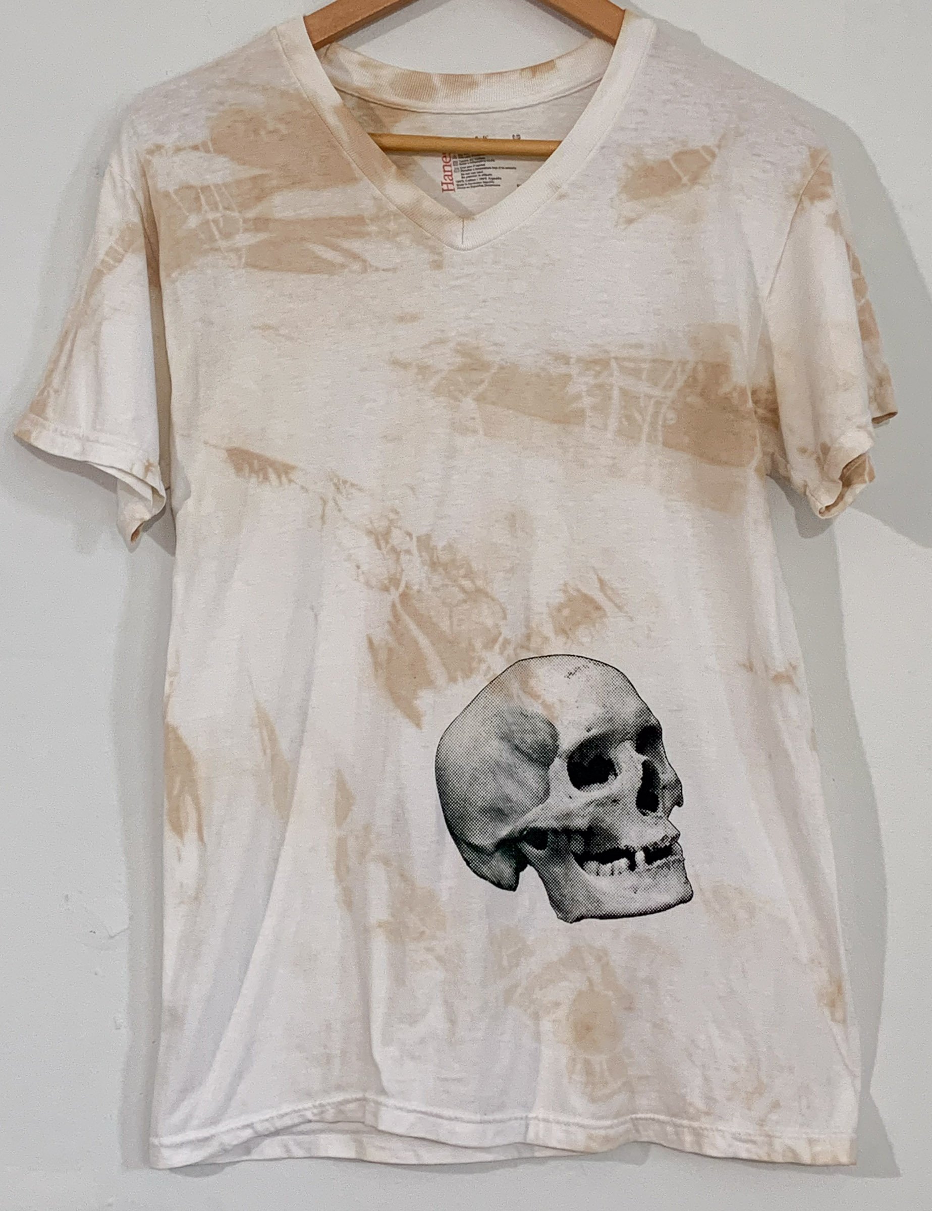 A rescued Hanes ComfortSoft v-neck tee, size Small, reworked with hand-dyed coffee + tea stain tie dye in a streaked, abstract pattern and a hand-pulled skull screenprint.